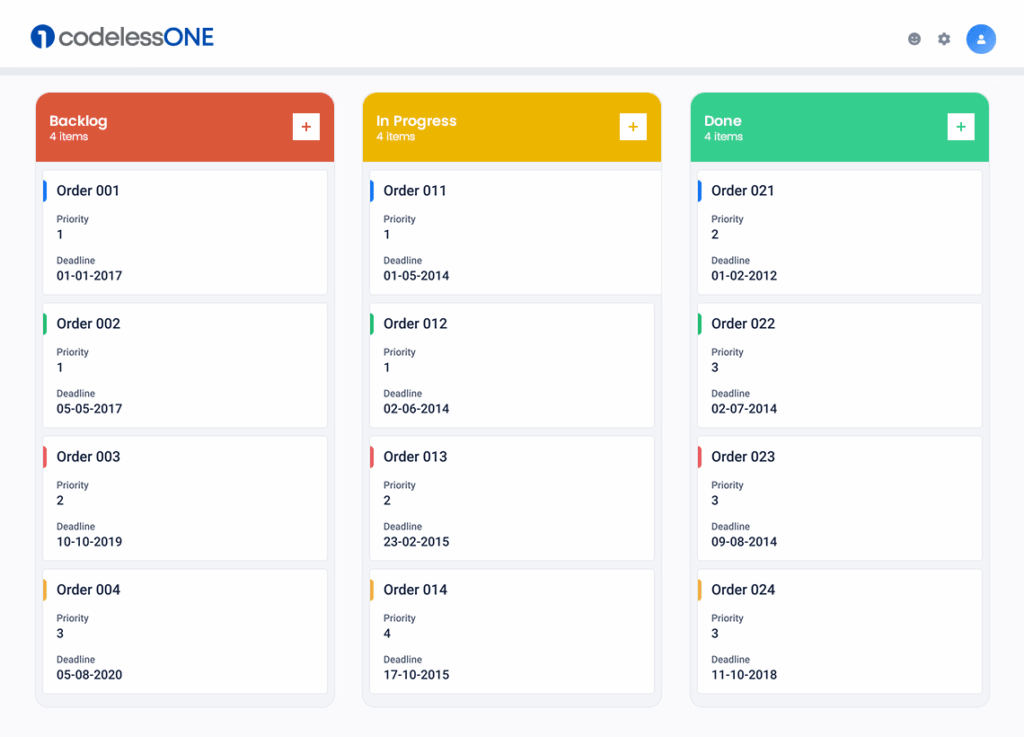 Turn complexity into clarity. Visualize tasks, track progress, and keep priorities aligned with a customizable Kanban board built in minutes with Codeless ONE.